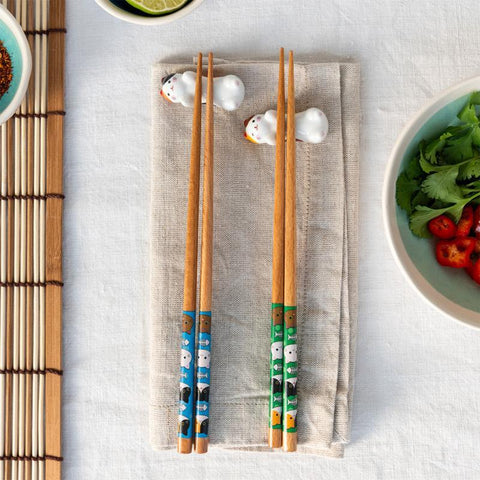 Enjoy Asian food the authentic way! This sweet noodle set features adorable cat-shaped chopstick rests and a pair of Japanese-style wooden chopsticks, each featuring cute cat illustrations.