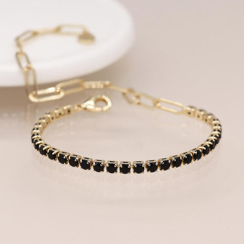 Gold Black Crystal BR Faux gold plated elegant single strand bracelet with black crystals and extension chain