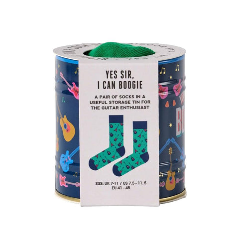 Guitar Socks Tin Strike the right chord with this pair of guitar-themed socks, neatly tucked inside a handy storage tin. A perfect gift for the music enthusiast. Size - UK 7 - 11