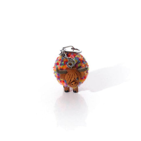 Rainbow Pom Pom Highland Coo Wooden Keyring