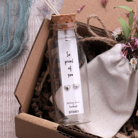 So Proud Heart ER Polished heart stud earrings in a bottle with a 'So Proud of You' message card Gift Ideas: Sterling silver heart shaped ear studs presented in a message bottle. A perfect gift to give a loved one, relative or friend. Item Description: Pair of stud earrings with butterfly backings Sterling silver or 18K gold plated sterling silver. Approximately 0.5cm