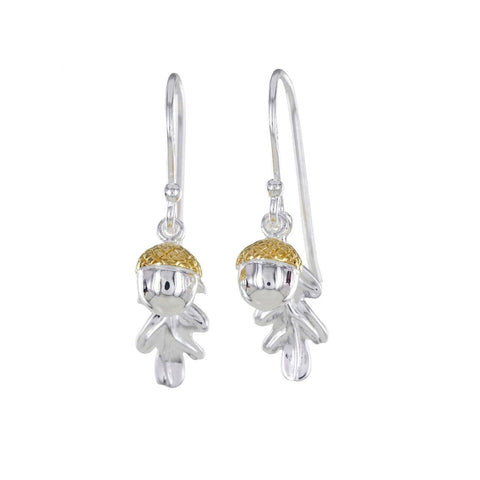 Oak & Acorn ER Our Oak Leaf and Acorn Sterling Silver and Gold Plated Earrings are totally irresistible and you can see why they are one of our best selling pieces! The most beautifully crafted acorn has a wonderful high shine finish to the sterling silver with a contrasting 18ct gold vermeil (plated sterling silver) textured finish to its cup. The acorn sits with an exquisitely detailed silver leaf, all hanging from a sterling silver hook which sits prettily in the ear when worn. Made from recycled Sterling Silver Sterling silver with 18ct gold vermeil (plated sterling silver) detail Leaf measures 12 x 6mm Acorn measures 6 x 6mm