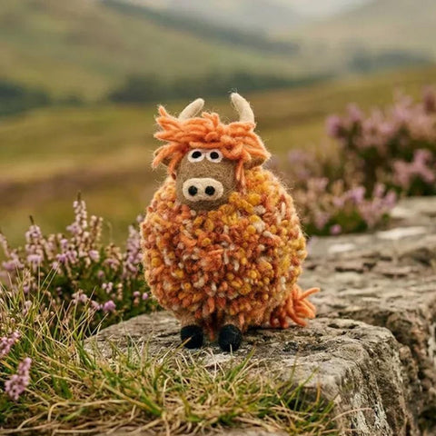 Duncan the Highland Cow is bringing the spirit of the Scottish Highlands with his magnificent horns and shaggy coat. This adorable wool felt ornament is sure to add a Scottish touch to any space.